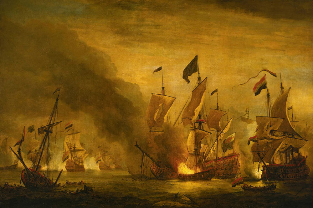 The Burning of the Royal James at the Battle of Solebay, 28 May 1672 (1672) designed by Willem Van de Velde the Elder, made by Thomas Poyntz. © National Maritime Museum, London