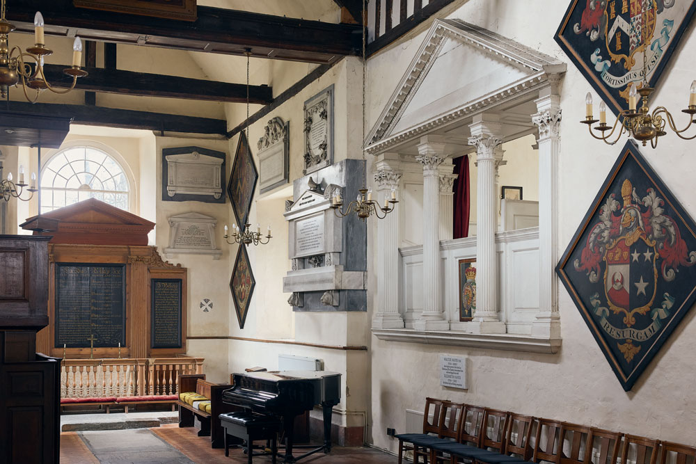 All of that makes the existence of a side chapel known as the Newcastle Pew in a church tucked just behind the high street in Esher, Surrey, a surprising footnote to Vanbrugh’s career. St George’s replaced an earlier, medieval building in around 1540, making it one of the first churches to be constructed after the Reformation. Its small, barnlike appearance does little to prepare the visitor for Vanbrugh’s addition nearly two centuries later: as seen from the main interior, a faintly surreal, pedimented Corinthian temple facade that looks like it belongs to the folly of a large estate, or to the royal box in a theatre. The inside of this raised ‘chamber pew’, a brick structure tacked on to the south side of the church, is accessed via a separate entrance outside, with stairs leading up to a warren of box pews. The lucky occupants of the front section of the chamber had more legroom,a view through the columned opening into the nave, and the benefit of a fireplace on either side. How had this curious addition to a small church in Surrey come about?