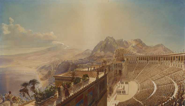 One of the things Viollet-le-Duc understood in Italy was that buildings survived only while life made use of them. The pieces he submitted to the Salon of 1840 would embody the insight in a pointed equivalent to the restoration projects required of the École des Beaux-Arts students who won the Grand Prix de Rome. Viollet-le-Duc envisaged the restoration of the amphitheatre at Taormina, presented in two extraordinary before-and-after panoramas. The first shows it in near monochrome watercolour, as he saw it at sunset in June 1836: caught between the mountains and the sea, it is a barren declivity, limned by a decaying curve of arches and the remnants of a colonnade. In the second, as if the restoration has extended to the landscape itself, everything is revivified: Etna emits a plume of white smoke, the sun sends a soft golden column down the centre of view and in the foreground, the theatre is crammed with attentive spectators on their seats, rapt before a drama. Restoration, peopled and bustling, winds back time to a perpetual high-noon of Greek civilisation.