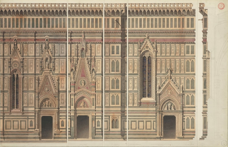 The selections in ‘Drawing Worlds’ show his attention to both the drama of life within buildings and the technicalities of their creation: a celebration of mass pierced by a sunbeam in the Palatine Chapel in Palermo; elevations of Santa Maria del Fiore in Florence and the Doge’s Palace in Venice; the minutiae of ceiling decorations in Messina. The centrality of drawing to Viollet-le-Duc’s outlook, as Bergdoll and Bressani note, cannot be overstated. In his pedagogical writings, he would elaborate a theory of it as a fundamental means of understanding the world. To really see (voir), rather than to merely look, ‘is to understand, it is to oblige the intelligence to become aware of objects’.