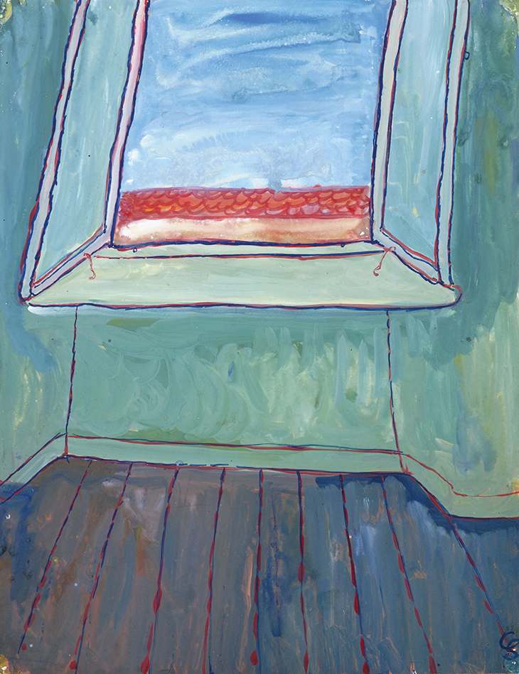 Salomon was living in uncertain, dangerous times, and had an acute sense of the proximity of death, but she wanted her paintings to endure. In February 1943, she wrapped the series in brown paper, giving it to a friend, the doctor Georges Moridis. She begged him to ‘take good care of it, it is my entire life’. Leben? oder Theater? speaks powerfully of a woman making art in the face of breakdown, family tragedy, war and national crisis. Jacqueline Rose has written eloquently about Salomon and the difficult contexts of her work in Women in Dark Times (2014). In darkness sometimes there’s a crack that lets the light get in. The work on show here – there are more than 200 small gouaches on display at the Jewish Museum – was Salomon’s light. The paint colours are intense and vivid, a mixture of blues, reds and yellows; bright flashes in the dark she found herself inhabiting. Colour can mean freedom here. In a key painting, an open window of blue sky beckons both the painter and the viewer; the space beyond the window is enticing, empty, clean. Her mother jumped out of one, killing herself when Salomon was eight years old. ‘The empty window’ (the description used by the curator), with its room of aquamarine walls, blue floorboards and open window, has an overlay with the words: ‘Now she no longer stands there. Ah me, in a different place, she now abides.’