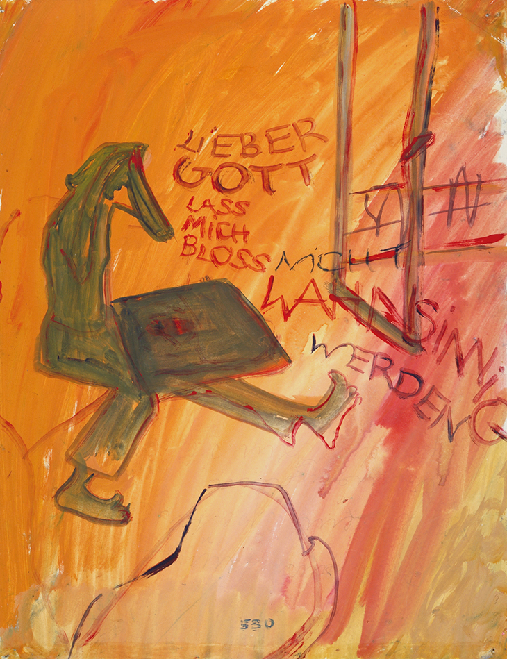 Salomon seems to have had a constant fear of going mad herself. One painting with an orange and red painted background features a figure done in rough dark brown brushstrokes, holding a book and clutching her head, one leg awkwardly extended in front of her. She looks despairing. The accompanying text, painted in red and dark brown paint in childish capitals on top of the fiery orange, reads: ‘Dear God, only please don’t let me go mad.’ It is a terrifying cry from the heart, but Salomon had a grit and a determination that kept her going, kept her painting. It’s possible that she also found a way to triumph over her abusive grandfather, who died from barbiturates hidden inside an omelette. Recently discovered pages written by her suggest she may have killed him.