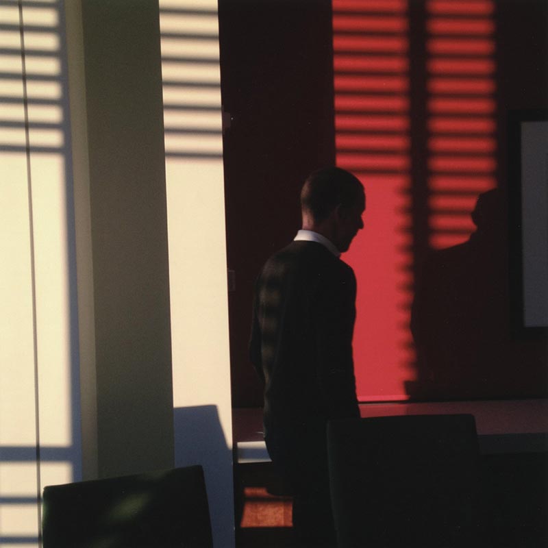 Ryan’s photographs convey a mixture of cool abstraction, the bleak monotony of workplace routine, and something like Kenneth Josephson’s urbane desire for transcendence. 12:06 p.m., June 12, 2014 is representative of her aesthetic. Framed harmoniously by metal façades, a woman dressed in black, her back to us, looks out into dense mist from the building’s roof. Replace the skyscrapers with mountains and you have an epic monochrome canvas of man confronting nature. But Ryan works in Manhattan where there are no mountains. The buildings will have to do.