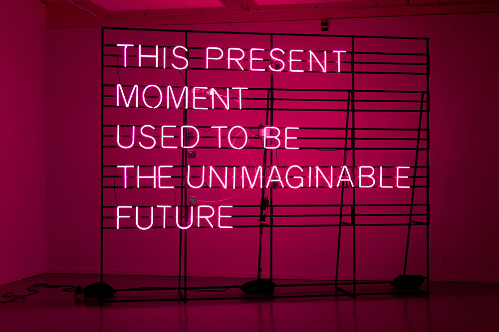 Alicia Eggert’s neon work illuminates a quote from revolutionary futurist Stewart Brand’s manifesto The Clock of the Long Now (1999) and presents an intriguing new perspective on time. The brilliant pink light is a reference to the Me Too movement of 2017 which empowered women to share their stories of sexual assault and to demand accountability. Click here to find out more.
