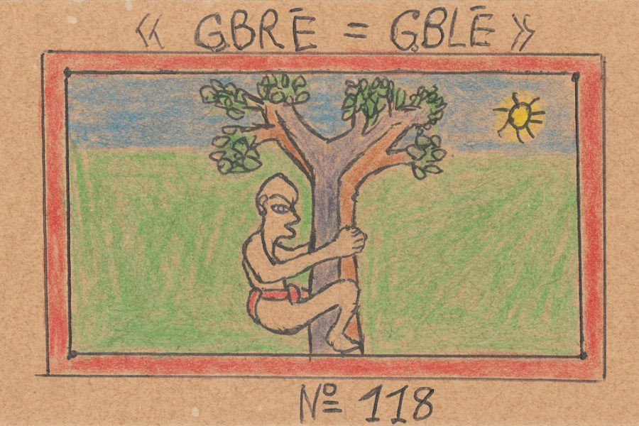 «Les pleurs de l’endeuillé se rendant aux funérailles d’un parent» from Musée du visage africain (1996), Frédéric Bruly Bouabré. Jean Pigozzi Collection of African Art. © 2022 Family of Frédéric Bruly Bouabré