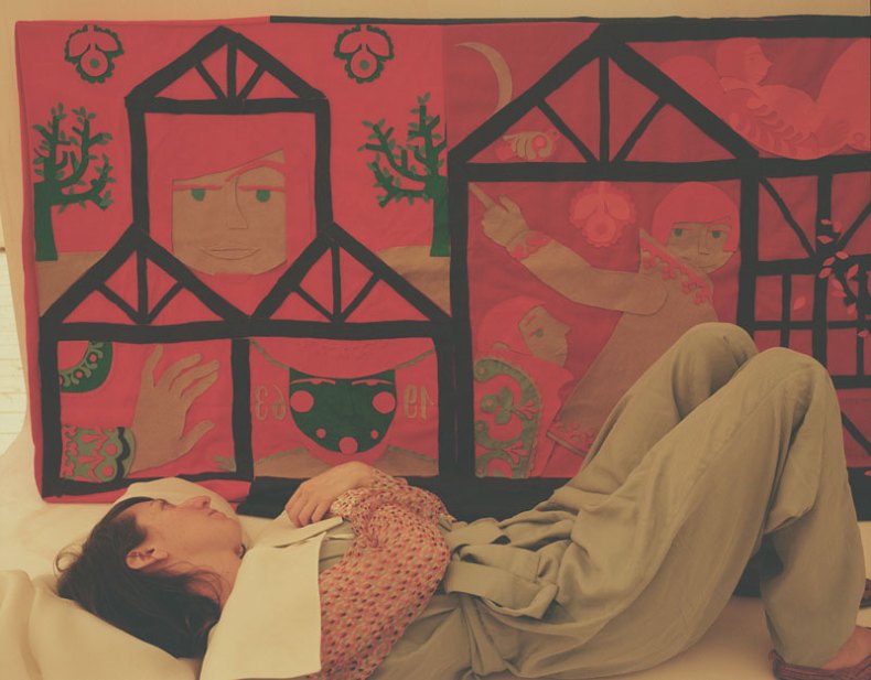 Some of the most exquisite images test these oppositions. One untitled painting (2001) depicts three contorted figures within an atmospheric green field. One boy lies on his stomach, with legs bent and splayed; he appears to be crawling or grasping for something to hold on to in this abstract space. Another is curled in a fetal position, with arms wedged between his bent and tucked knees. A stern older man hovers above them, but his body dissolves beneath a billowing coat, which parachutes outwards and merges with the background. In such compositions, the image field is like a watery surface: some details – bent knuckles, furtive glances – rise up from it, coherent and delineated, while others seem submerged or out of reach.