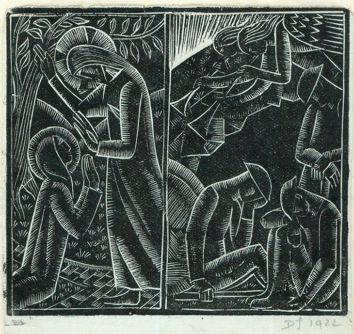 The same is true, though in reverse, in David Jones’s beautiful wood engraving Noli Me Tangere/Soldiers at the Tomb (1922). Here, a similar idea about the meaning of touch and the tomb is expressed by inverted means. In engraving, lines cut into the wood show white, giving a chalky radiance to Jones’s figures; blank space is, correspondingly, black. On the right-hand side of the picture, sleeping soldiers – at once the biblical Romans set before the tomb to guard it, and exhausted servicemen of the First World War – rest before the absolute black of the tomb space, from which, in their inattention, the stone has been rolled back. The tomb here is also a dugout, at once historicising the noli me tangere in Jones’s recent experience and making reference to the gouging and digging tools that are the common implements of the artist and of Christ as gardener, though here, paradoxically, rendered through the largest untouched section of the block. It makes literal and contradicts the latent pun in ‘engraving’ at the same time. The tomb’s dark is the only uninterrupted expanse of blankness in the image: everywhere else, ground is diversified with paving or grass, surface with contour, sky with rays. The angels’ trumpets direct us instead to the twofold figure of Mary and Jesus, the bright counter to the blankness of the tomb. Here, the avoidance of touch has moved directly into benediction, and Mary, rather than reaching for Jesus, raises her hands as if to receive a blessing, a willing acceptance of distance.