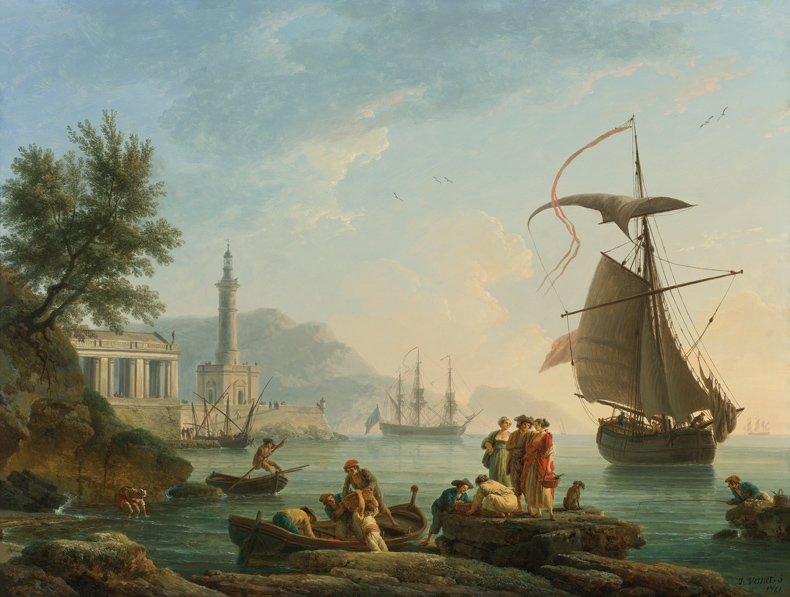 A Mediterranean Harbor At Sunset With Fisherfolk At The Water’s Edge, A Lighthouse And A Man Of War At Anchor In The Bay (1761), Claude-Joseph Vernet