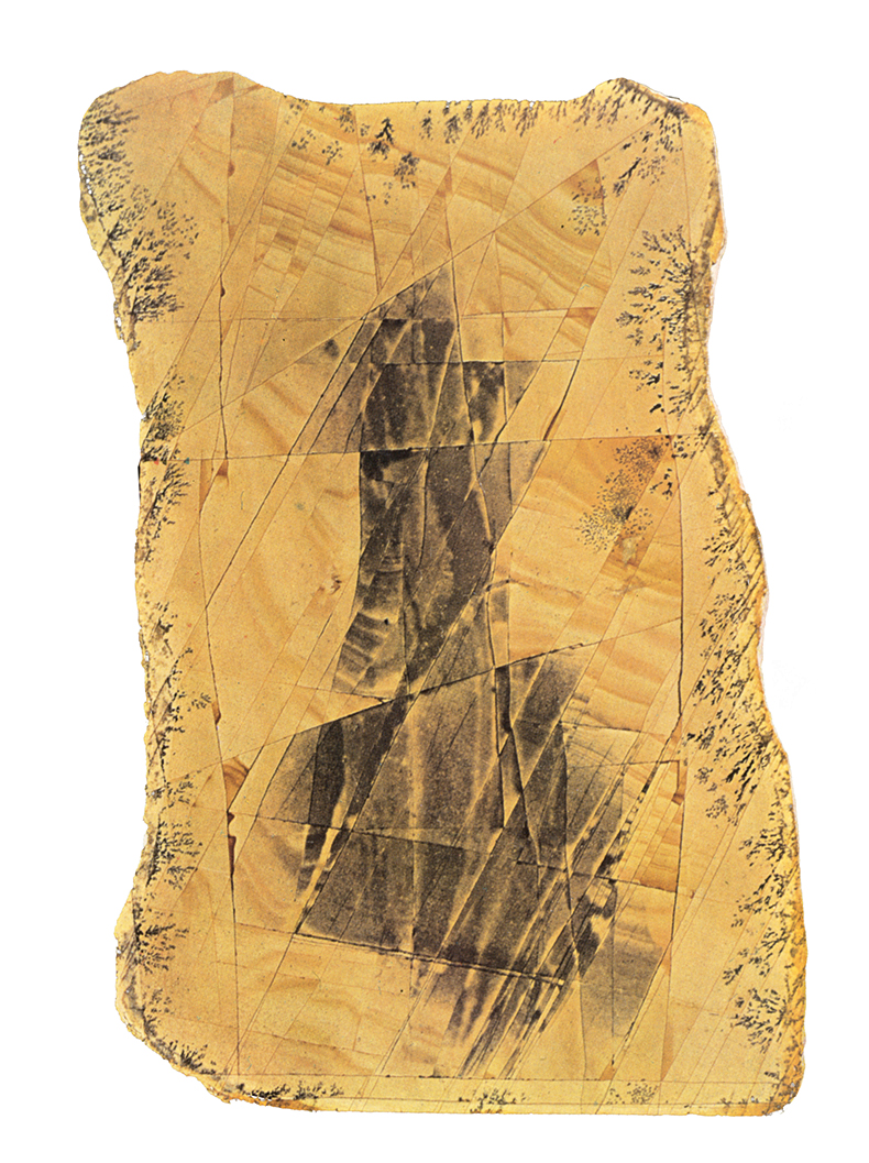 The impact of culture on interpretation comes to the fore as Caillois contemplates a fretted sheet of golden limestone. To modern eyes, the patterned grey fragments at the centre of the stone carry a picture of a man – though perhaps not one that would have been evident to our forebears, for this shattered image is recognisable as a man to those whose vision has been schooled by Cubism. In searching for a reason for the ‘unwearying and irrational zeal that makes man give a meaning to all appearances devoid of it, to look for parallels everywhere, and to create them where they do not already exist,’ Caillois imagines that our appetite for metaphor, analogy and patterns is part of some deep-rooted grasping for sense and significance. The Writing of Stones is thus a route to explore our hunger to order the world according to an underlying symbolic system, or what Caillois describes as ‘a universal syntax’.