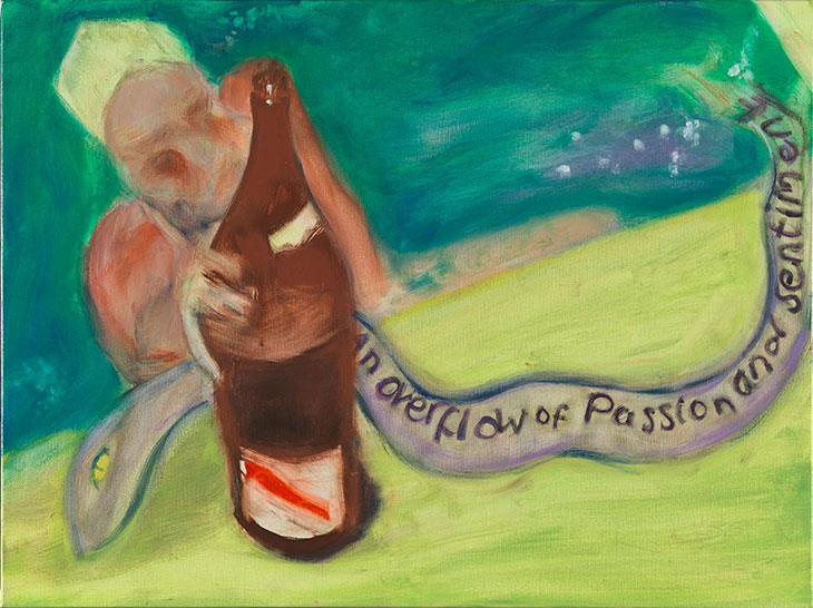 The four pieces that are on view have been selected for their relationship to – and have been hung alongside – the works Nashashibi consistently found herself drawn to during her residency: the National Gallery’s collection of 17th-century Spanish paintings. For Nashashibi, it was these works’ excesses that pulled her in – or rather, the simultaneous attraction and repulsion of the abundant yet palpably artificial feeling conveyed in their dramatic compositions. The words ‘an overflow of passion and sentiment’ (also the title of the display) are scrawled on a snake-like banner that unfurls across one of Nashashibi’s paintings, a small, enigmatic canvas that bears little to no hint of emotion. From the caption of An Overflow (2020) we learn that the composition is based on a still image of Ingrid Bergman in a swimming pool. While any distinctive features are obscured, you can easily make out a pinkish form in a swimming cap reaching up from an aquamarine abyss to grasp a glass bottle – champagne, apparently – from a lime-green ledge. The banner weaves its way through the gap between Bergman’s body and the bottle, occupying an ambiguous space akin to that of trompe l’oeil scraps of parchment bearing the names of artists or sitters in historic paintings. Yet the banner’s intended reference, the caption also tells us, is to ‘the dragon’s long tail in Velázquez’s depiction of Saint John the Evangelist nearby’.
