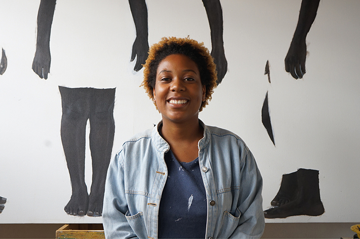 Working in acrylic with a pared-back palette of browns and blacks, the Tanzanian painter Sungi Mlengeya creates arresting portraits and double-portraits of men and women from East Africa, and places them against conspicuously blank, white backgrounds. The artist describes these backdrops as ‘a place of calm, free and detached from social norms and restrictions, real and imagined’. If there is an idealising impulse behind these works, the artist’s use of white space also allows her to achieve an intimate realism; by placing the spotlight squarely upon her subjects, she makes their inner lives and emotions the focus of the viewer’s imaginative response. A recent series of works shown at 1–54 Contemporary African Art Fair in New York depicts a number of women who look at the viewer with calm and collected dignity, while the varying arrangement of the figures invites us to guess the nature of the relationship between them. Mlengeya is self-taught and left a career in banking to paint full-time as recently as 2018. Since then her work has been shown to acclaim at Latitudes Art Fair in Johannesburg, Afriart Gallery Kampala and the Cape Town Art Fair.