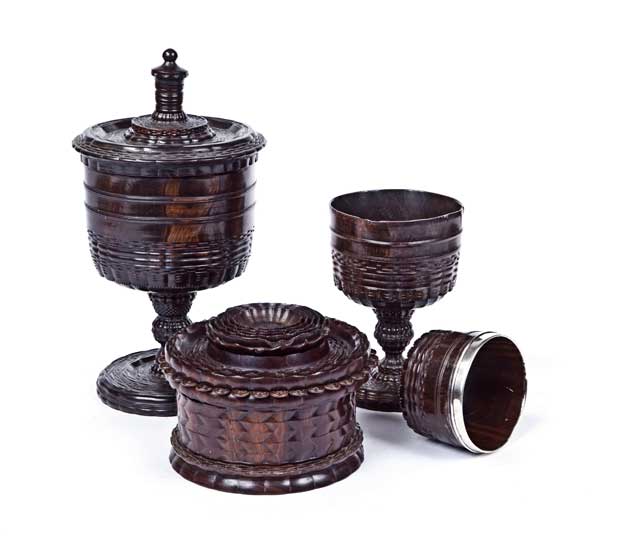 A rare collection of Lignum Vitae ornamentally turned objects by ‘The Tudor Court Turner and his inheritor’, England (late 16th and early 17th century). Porfirius Kunstkammer. Collection John Hawkins